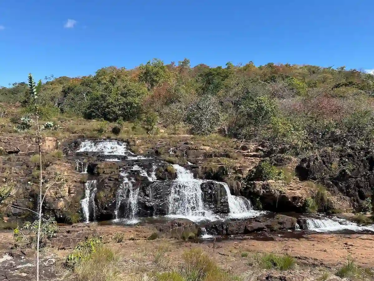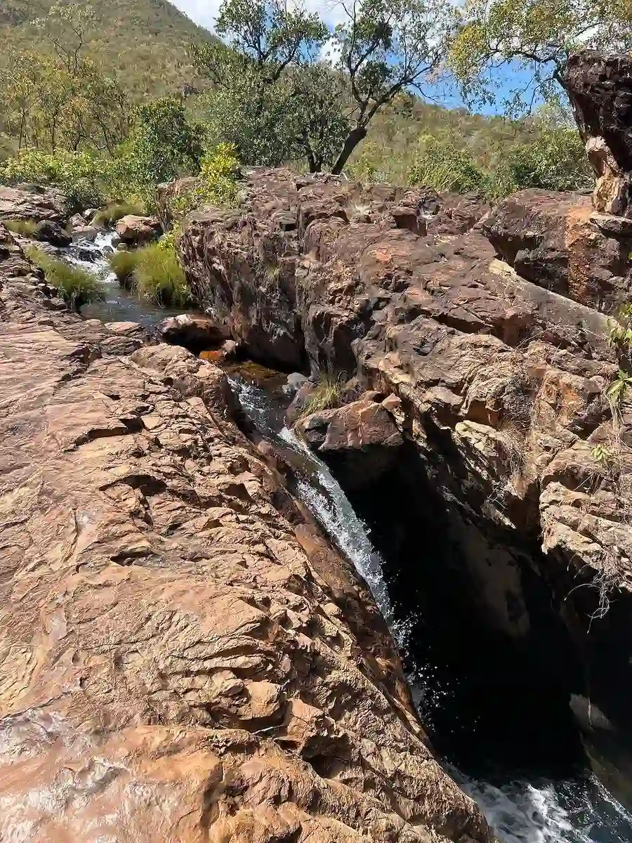A última parada, ladeira abaixo, está a inusitada Cachoeira do Encontro. Por obra da natureza na Chapada dos Veadeiros, é uma queda d’água de aproximadamente 50 metros, formada, precisamente, no encontro dos rios Macaquinho e Fundão. A trilha acaba aqui. O rio segue até sumir na enorme fenda da Cachoeira do Dragão.