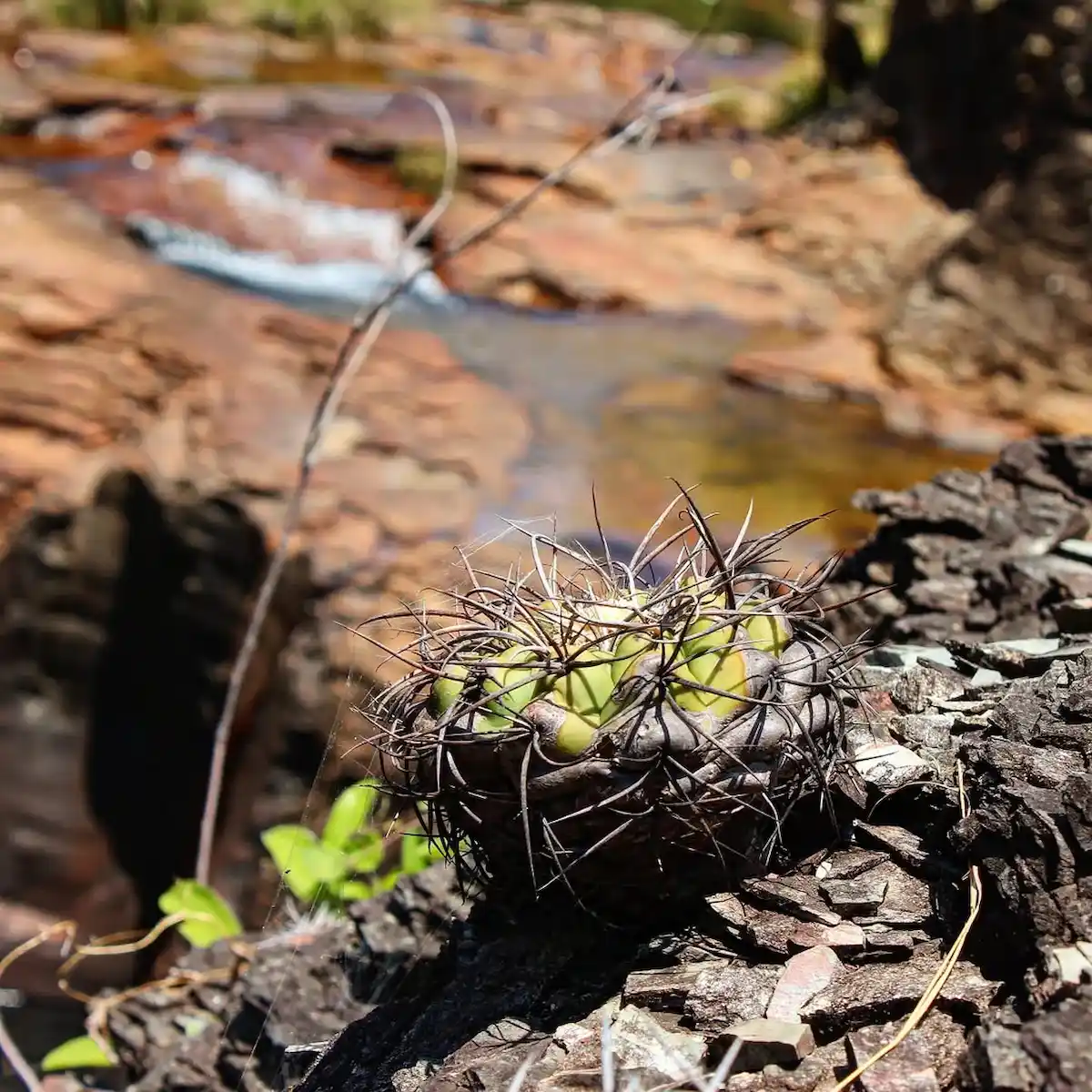 Ao longo do leito do rio e arredores, a paisagem é o habitat de uma espécie endêmica de cactos, pequeno e bojudinho, que se fixa à rocha de forma muito frágil. Atenção, não toque, apenas observe ou fotografe.